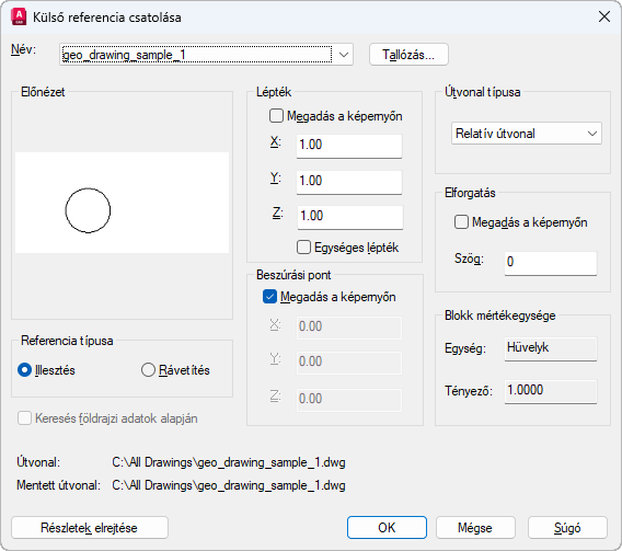 Megjeleníti azt az útvonalat, amely mentődik a rajzzal a külső referencia fájl csatolásakor. Az útvonal az Útvonal típusa beállítástól függ.