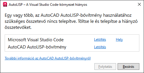 Ha a LISPSYS értéke nem nulla, az AutoCAD ellenőrzi, hogy a Visual Studio Code és az AutoCAD AutoLISP-bővítmény telepítve van-e. Ha a Visual Studio Code nincs telepítve, az alábbi üzenetpanel jelenik meg.