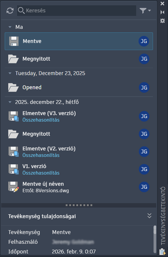 Minden AutoCAD-termék rögzíti a rajzolási tevékenységeket. Az AutoCAD LT azonban jelenleg csak a verziótevékenységeket jeleníti meg a palettán, az AutoCAD mobilalkalmazás pedig még nem rendelkezik Tevékenységbetekintő palettával. Ha különböző AutoCAD-termékeket használó együttműködőkkel dolgozik, győződjön meg arról, hogy mindannyian ugyanarra a Tevékenységbetekintő-helyre mentenek.