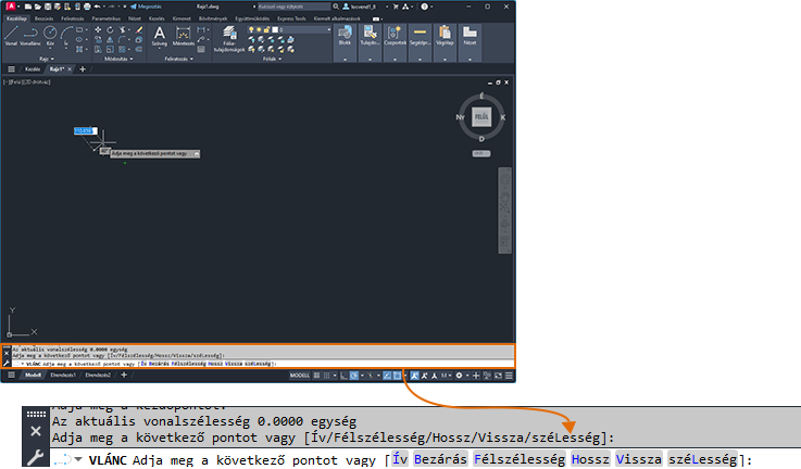 A rögzített parancsablak ugyanolyan széles, mint az alkalmazás ablaka. Állandó helyen jelenik meg, a rajzterület fölött vagy alatt.
