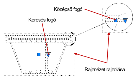 Az ábrán két modelldokumentációs rajznézet, egy bázisnézet és egy részletnézet látható, amelyeket kattintással választott ki.
