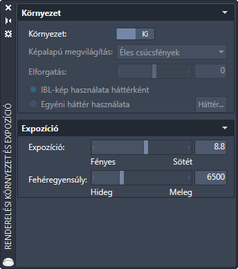 A Renderelési környezet és expozíció paletta a jelenetek globális megvilágításának beállításához használható.