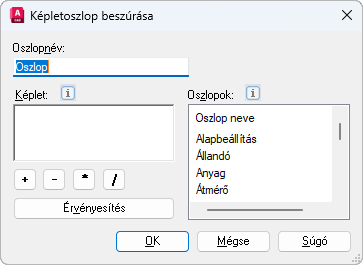 Megjeleníti a kiemelt rajzadatok és külső adatok (ha van adatkapcsolat) oszlopainak nevét. Ha duplán kattint az oszlop nevére, akkor az bekerül a Képlet mezőbe, de az oszlop nevét az Oszlop listáról is behúzhatja a Képlet mezőbe. A meglévő képlet oszlopok nincsenek felsorolva, és nem lehetnek más, újonnan készített képlet oszlopok értékei.