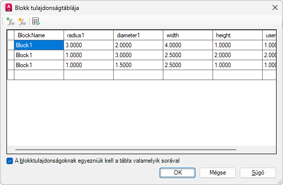 A Blokk tulajdonságtáblája párbeszédpanelen az oszlopok fejlécei a paramétereket jelölik, a sorok pedig a tulajdonságkészlet-értékeket adják meg. Beállíthat egy kijelölt blokkreferenciát a megadott értékekhez. Mindegyik blokkdefiníció csak egy táblát tartalmazhat.