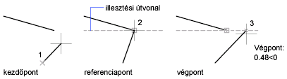 A következő ábrán a Végpont tárgyraszter van bekapcsolva. Egy vonal rajzolását a kezdőpontjára (1) kattintással indíthatja el, átmozgatva az egérmutatót egy másik vonal végpont felett (2), hogy referenciaponttá váljon, majd ezután végigmozgatva a mutatót a vízszintes illesztés mentén, hogy elhelyezze a rajzolás alatt álló vonal (3) kívánt végpontját.