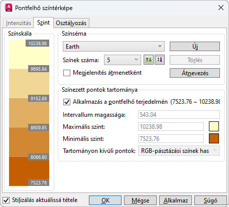 Az Intenzitás, a Magasság és az Osztályozás stilizálások a pontfelhő érintett pontadatai alapján színezik a pontfelhőt. Kiválaszthat egy előre meghatározott színsémát, amilyen például a Spektrum vagy a Föld, illetve létrehozhat saját sémákat is. Hozzárendelheti ugyanazt a sémát az Intenzitáshoz és a Szintmagassághoz, vagy eltérő sémát is rendelhet hozzájuk. Az osztályozás külön sémakészlettel rendelkezik.