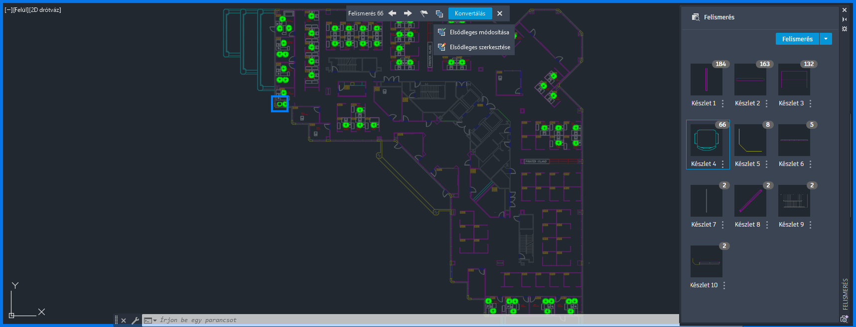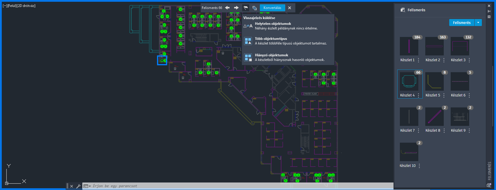 A Felismerés és konvertálás funkció elemzi a rajzokat, hogy gyorsan azonosíthassa a blokkokká konvertálható objektumokat. Ez a funkció időt takarít meg, növeli a termelékenységet és csökkenti a blokk-konvertálási folyamat hibáit.
