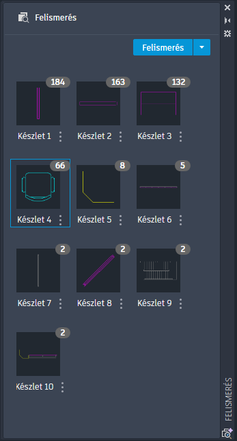 A Felismerés elindításakor az Autodesk AI megvizsgálja a rajz geometriáját. A rajzelemzés befejezése után a paletta értesíteni fogja, ha a program blokkokká konvertálható objektumokat észlelt. A készlet hasonló felismert objektumok csoportja, amelyeket egyetlen blokká lehet konvertálni.
