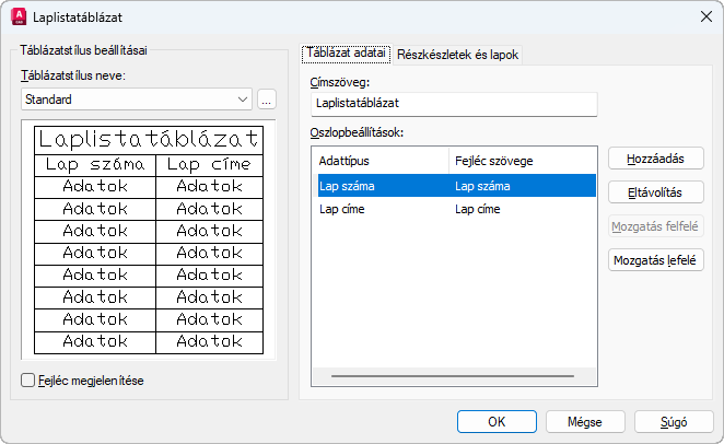 Ez a táblázat az aktuális lapkészletben bármelyik laphoz hozzáadható, de jellemzően a címlaphoz adódik hozzá.