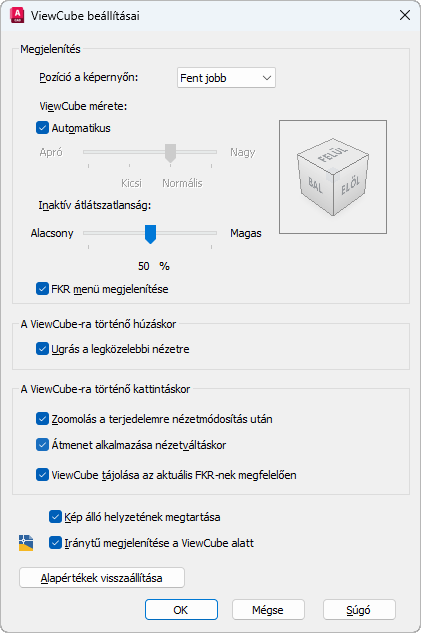 Az alapértelmezett beállításokat alkalmazza a ViewCube eszközre.
