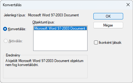 Az Objektumtípus területen megadott típusként nyitja meg a beágyazott objektumot, de a módosítás után visszatér az aktuális típushoz.