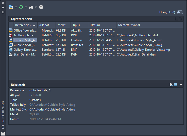 Részletek módban a kijelölt fájlreferencia tulajdonságai jelennek meg. Minden fájlreferenciának van egy alap tulajdonságkészlete, továbbá néhány fájlreferencia, például a képreferencia, az adott fájltípusra specifikus tulajdonságokat jelenít meg. A részletek legfontosabb csoportjába tartozik a referencia neve, az állapot, a fájlméret, a létrehozás dátuma, a mentett elérési út, a megtalált elérési út és a fájlverzió, ha telepítve van az Autodesk Vault kliens (az AutoCAD LT szoftverben nem érhető el). A tulajdonságok némelyike módosítható.