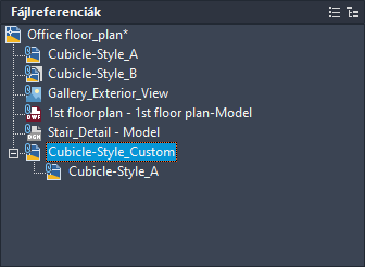 A fa nézet felső szintje mindig az aktuális rajzot mutatja. A hivatkozott fájlok a következő szinten jelennek meg. A hivatkozott fájlok tartalmazzák saját beágyazott fájlreferenciáikat, amelyek megnyithatók a mélyebb szintek megjelenítéséhez. Amikor fanézetben végez kijelölést, akkor egyszerre csak egy fájlreferencia jelölhető ki.