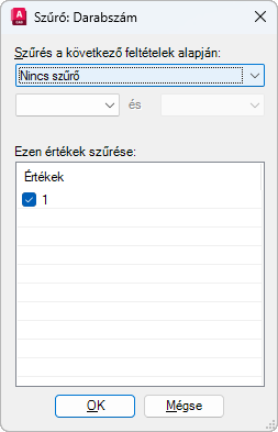 Az éppen szűrt adatok típusától függően értékek listáját jeleníti meg. A numerikus adatokra vonatkozó szűrők: Nagyobb mint >, Egyenlő, Közé esik stb. A szöveges adatokra vonatkozó szűrők: Egyenlő, Nem egyenlő, Tartalmazza és Kezdete.