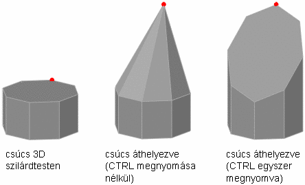 A 3D szilárdtestek és felületek alakját egy vagy több csúcspont módosításával változtathatja meg. Használja a fogókat és a minialkalmazásokat, vagy futtassa a 3DMOZGAT, 3DFORGAT vagy 3DLÉPTÉK parancsot. Csúcspontok léptékezésekor és elforgatásakor legalább két csúcspontot kell kijelölnie az objektum módosításához. Egy csúcspontra kattintva és azt húzva "megnyújtható" a 3D objektum.