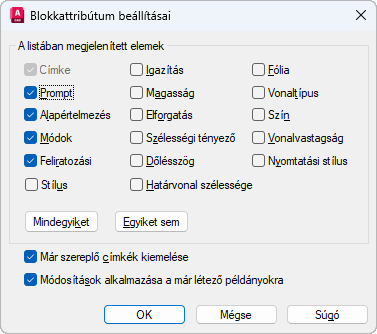 Meghatározza az attribútumlistában megjelenítendő tulajdonságokat. Csak a kijelölt tulajdonságok jelennek meg a listában. A Címke tulajdonság mindig ki van jelölve.