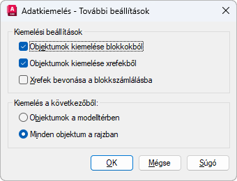 A külső hivatkozású (xref) fájlokban található objektumokat és blokkokat is használja.