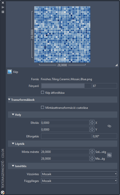 Kép vagy procedurális alapú textúrák tulajdonságait szerkeszti.