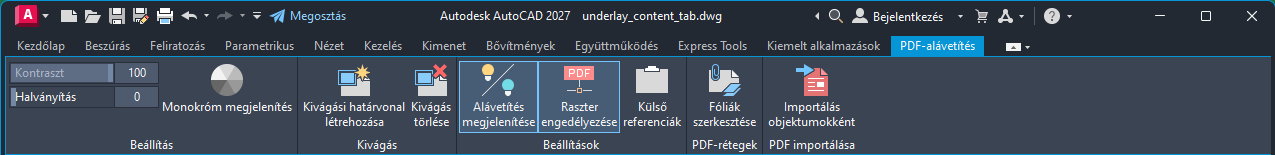 Amikor kiválaszt egy PDF-alávetítést, a szalagon megjelenik a PDF környezetfüggő lap.