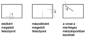 A követés használható például egy téglalap középpontjának szerkesztővonalak nélkül történő meghatározására. Indítsa el a követést, és határozza meg az egyik vízszintes vonal felezőpontját. Vontassa a mutatót függőlegesen, és határozza meg az egyik függőleges vonal felezőpontját (2). Nyomja le az Enter billentyűt a téglalap közepén található pont (3) elfogadásához.