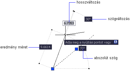 Amikor a méretbevitel be van kapcsolva a dinamikus eszköztippekhez, az eszköztipp távolság- és szögértékeket jelenít meg, miközben egy parancs a második pont megadását várja. Az eszköztippek méretei az egérmutató mozgatásával változnak. A Tab billentyűvel léphet a módosítani kívánt értékre. A méretbevitel a következő parancsok esetében lehetséges: ÍV, KÖR, ELLIPSZ, VONAL és VLÁNC.