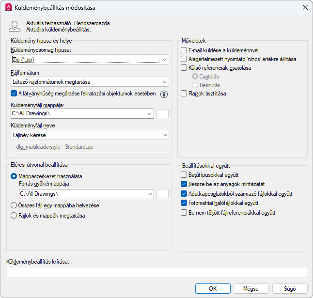 Ha nem módosítja ezt a mezőt, akkor a küldeményfájl az elsőnek megadott rajzfájlt tartalmazó mappában került létrehozásra. Lapkészlet-környezetben a küldeményfájl a lapkészletadat (DST) -fájlt tartalmazó mappában kerül létrehozásra. (Az AutoCAD LT programban nem alkalmazható.)