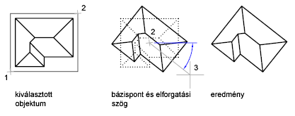Elforgathatja például egy ház normálnézetét az objektumok kiválasztása (1) és egy bázispont megadása (2) után, majd egy elforgatási szög megadásával, olyan módon, hogy egy másik pontba húzza a mutatót (3).