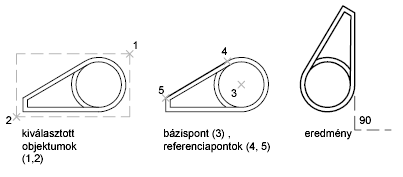 Az illusztráción például látható alkatrész elforgatásához olya módon, hogy az átlós éle 90 fokos irányba kerüljön, jelölje ki a forgatandó objektumokat (1, 2), adja meg a bázispontot (3), és írja be a Referencia opciót. A referenciaszöghöz adja meg az átlós vonal két végpontját (4, 5). Az új szöghöz írja be: 90