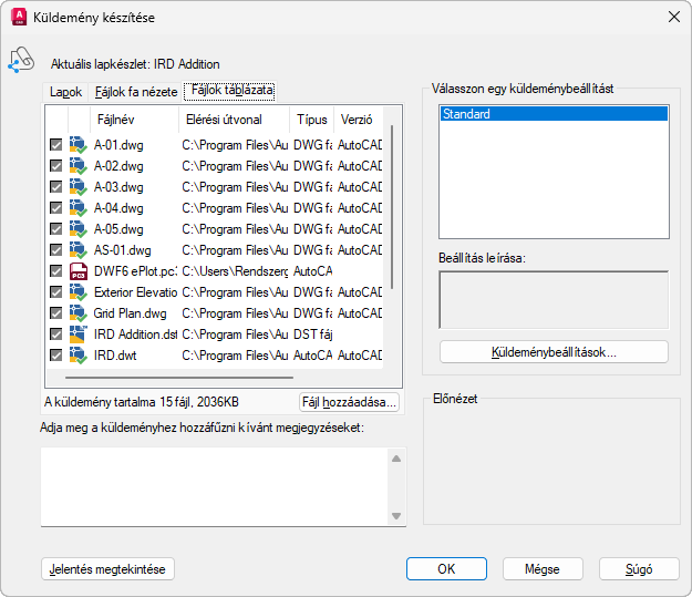 Jelentésinformációt jelenít meg, amely belekerül a küldeménycsomagba. Magában foglal minden beírt küldemény-megjegyzést, és tartalmazza azokat a program által automatikusan létrehozott disztribúciós megjegyzéseket, amelyek részletezik, hogy milyen lépések szükségesek a küldeménycsomag tökéletes működéséhez. Ha például SHX betűtípusok találhatók egy küldött rajzban, megjelenik egy útmutató arról, hova kell másolnia ezeket a fájlokat ahhoz, hogy azok a küldeményt telepítő számítógépen észlelhetők legyenek. Ha készült alapértelmezett megjegyzéseket tartalmazó szövegfájl, akkor a jelentés ezeket is tartalmazza.
