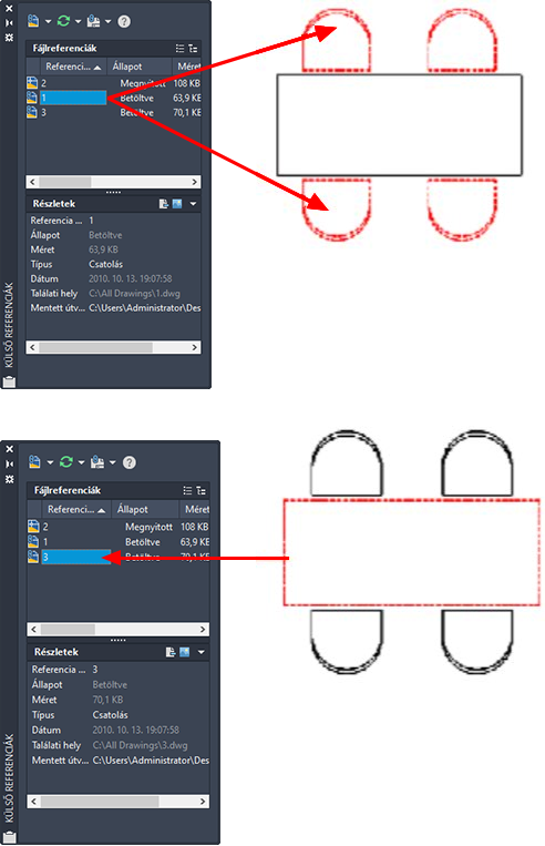 Összetett rajzban adott külső referencia megkereséséhez jelöljön ki egy elemet a Külső referenciák palettán, hogy a program kiemelje annak összes látható példányát a rajzban. Ugyanez a másik irányban is működik: a rajzban kijelölt külső hivatkozás nevét a program kiemeli a Külső referenciák palettán.