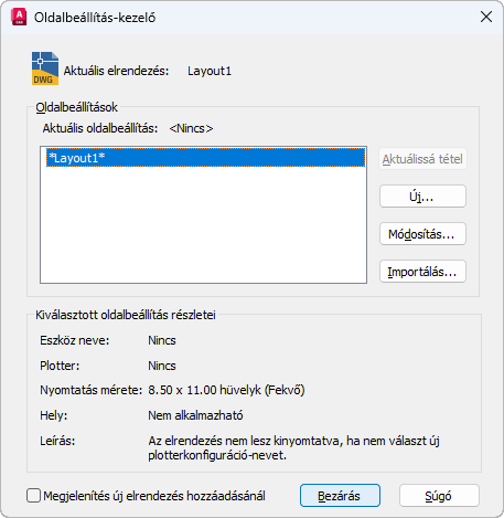 Létrehozhat továbbá elnevezett oldalbeállításokat, módosíthat meglévőket, vagy importálhatja más rajzok oldalbeállításait.