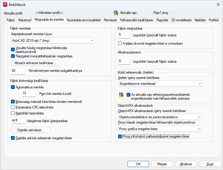 Azokat a beállításokat vezérli, amelyek az AutoCAD futásidejű kiterjesztés alkalmazásokkal és proxy grafikákkal kapcsolatosak.