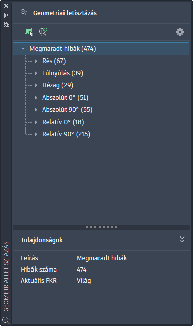 Fa nézetbe rendezve megjeleníti az aktuális rajz vagy a kijelölt tartalmak összes észlelt hibáját. A hibatípusok a következők lehetnek: térköz, túlnyúlás, hézag, abszolút szög és relatív szög.