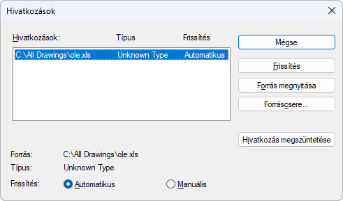 Szétbontja a csatolást az objektum és az eredeti fájl között. A rajz objektuma konvertálásra kerül WMF (Windows metafájl) formátumúra, az új fájlra nincsenek hatással az eredeti fájl jövőbeni megváltozásai.