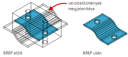 A kijelölt összetett objektum előzményeit el is távolíthatja, ha az Előzmények beállításnak Nincs értéket ad, vagy ha kiadja a BREP parancsot. Az előzmények eltávolítását követően megszűnik annak lehetősége, hogy a szilárdtest eredeti, törölt összetevőit kijelölje és módosítsa. A szilárdtest előzményeinek tárolását újraindíthatja, ha Előzmények beállítását ismét Felvétel értékre állítja.