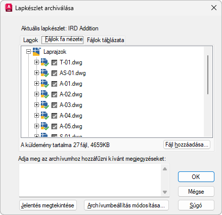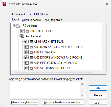 Az archív csomagba kerülő lapok listáját jeleníti meg lapsorrendben, az összefüggések figyelembe vételével. Egy lapkészletnek nyitva kell lennie a Lapkészlet kezelőben. Az archiválást a megjelenő helyi menüből választhatja ki, ha a jobb gombbal kattint a legfelső szinten található lapkészlet csomópontra, de beírhatja az ARCHIVÁL parancsot is a parancsprompthoz.