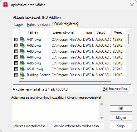 Táblázat formájában jeleníti meg az archív csomagba kerülő fájlokat. Alapértelmezésben minden olyan fájl, amely az aktuális rajzhoz tartozik (például az xrefek, nyomtatási stílusok és betűtípusok), szerepel a listán. További fájlokat adhat az archív csomaghoz, vagy már ott lévő fájlokat távolíthat el. URL címek által hivatkozott kapcsolódó fájlok nem kerülnek az archív csomagba.