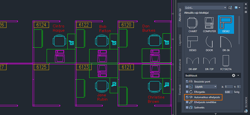 Az automatikus blokkelhelyezés lehetővé teszi a blokkok egyszerű beillesztését a Blokkok paletta használatával, valamint javaslatokat biztosít a hasonló geometria és a rajzban található korábbi blokkpéldányok megismert mintái alapján.