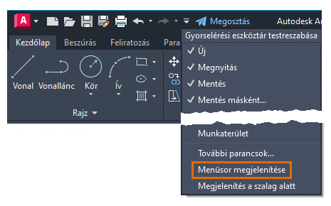 A menüsor a Gyorselérési eszköztár legördülő menüjéből engedélyezhető, illetve a felhasználói kezelőfelület testreszabása révén a CUI parancs használatával.