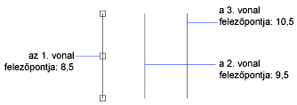Ha a Ctrl billentyűt nyomva tartja a többszörös másolási pontok mutatóeszközzel való kiválasztásakor, a grafikus mutató az utolsó két kiválasztott pont által meghatározott raszterpontra ugrik. A következő ábrán az 1. vonal felezőpontja a 8,5 koordinátaértékeknél található. Az adott felezőpont alapján a 2. vonal másolására került sor a Ctrl billentyű és a Nyújtás fogómód segítségével; a felezőpont helye: 9,5. A harmadik vonal a 10,5 koordinátaértékek által meghatározott raszterpontra ugrik.