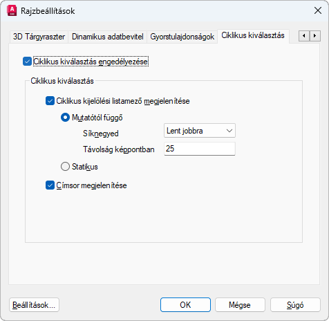 A ciklikus kiválasztás lehetővé teszi az átfedő objektumok közüli választást a Shift és a szóköz együttes lenyomásával. Meghatározhatja, hogy jelölje-e egy kék mutató az átfedő objektumokat, és megadhatja a megjelenítési beállításokat a Kiválasztás listában.