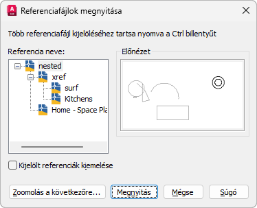 A Referenciafájlok megnyitása párbeszédpanel egy referenciafában az összes egymásba ágyazott xrefet megjeleníti. A kijelölt xref forrásfájlja egy külön rajzablakban nyílik meg, ahol szerkeszthető, menthető, majd bezárható a rajz.