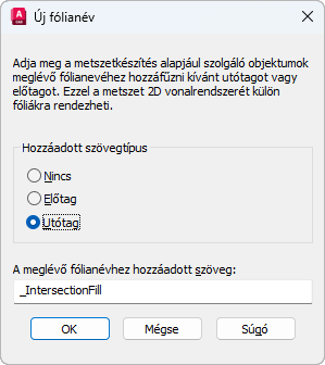 Alapértelmezés szerint az összes metszetblokk-geometria a 0-s (nullás) fóliára kerül. Azonban megadhat a metszetblokk komponenseinek rendszerezését segítő elő- vagy utótagot, például a metszet határvonalát és kitöltését. Amikor a metszetblokk beillesztésre kerül, a metszetblokk komponensei olyan új fóliára kerülnek, amelynek neve együttesen tartalmazza a metszet objektum fóliájának nevét és a megadott elő- vagy utótagot. Ha a metszősík két vagy több fólián elhelyezkedő objektumot tartalmaz, akkor két vagy több új objektumfólia keletkezik.