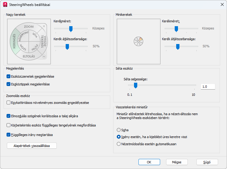 Azt szabályozza, hogy módosítani lehet-e az aktuális nézetet a Z tengely irányában a Körbetekintés és a Fel/Le eszköz használatakor.
