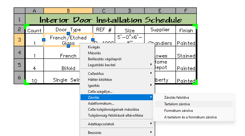 Alapértelmezés szerint az adatkiemelési táblázat cellái nem szerkeszthetők, de formázhatók. A cellák adatszerkesztési és formázási zárolása, illetve a zárolások feloldása a táblázat helyi menüjének segítségével végezhető el.