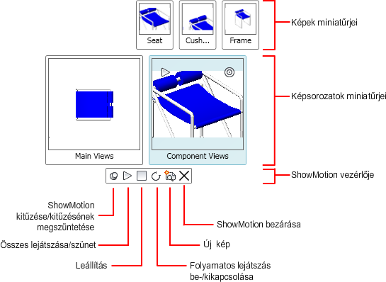A ShowMotion három főbb részből áll: a felvételek miniatűrjeiből, a felvételsorozatok miniatűrjeiből, valamint a ShowMotion vezérlőelemeiből. A lent található ShowMotion vezérlő segítségével lejátszhatja a felvételhez társított animációkat, rögzítheti és feloldhatja a ShowMotion felületét, illetve be is zárhatja a ShowMotion eszközt. A felvételek és felvételsorozatok miniatűrjei segítségével navigálhat az aktuális modellhez tartozó felvételek között.