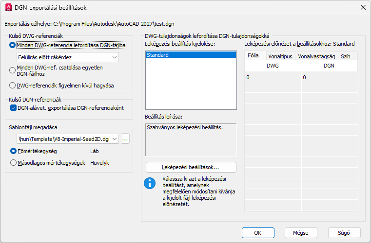 Az alapértelmezett leképezési beállítás a Standard, amely adatokat emel ki az éppen exportált rajzból, és a leképezési előnézetben látható módon automatikusan leképezi a DGN-fóliákat, a -vonalvastagságokat és a -színeket.