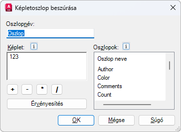 Megjeleníti a kiemelt rajzadatok és külső adatok (ha van adatkapcsolat) oszlopainak nevét. Ha duplán kattint az oszlop nevére, akkor az bekerül a Képlet mezőbe, de az oszlop nevét az Oszlop listáról is behúzhatja a Képlet mezőbe. A meglévő képlet oszlopok nincsenek felsorolva, és nem lehetnek más, újonnan készített képlet oszlopok értékei.