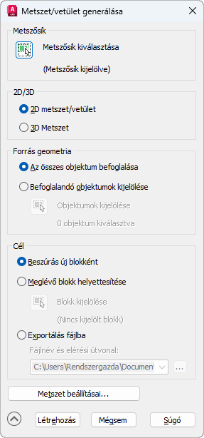 Megadja a fájlnevet és elérési útvonalat, ahova a metszet mentése történik.