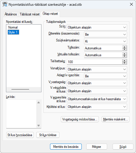 Az elnevezett nyomtatási stílus táblázatokban lévő nyomtatási stílusok nevét jeleníti meg. Az elnevezett nyomtatási stílus táblázatokban levő nyomtatási stílusok módosíthatók. A színfüggő nyomtatási stílus táblázatokban lévő nyomtatási stílus nevek objektumszínekhez kötődnek, és nem módosíthatók. A program legfeljebb 255 karakter hosszú stílus neveket képes kezelni.